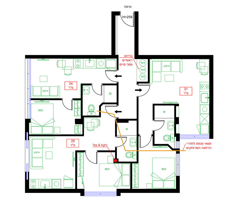 1. פיצול התשתיות והעמדת חדרי הרחצה והמטבחים באופן שיאפשר לשמור על שיפוע ניקוז תקני עד לניקוז הבניין האנכי.